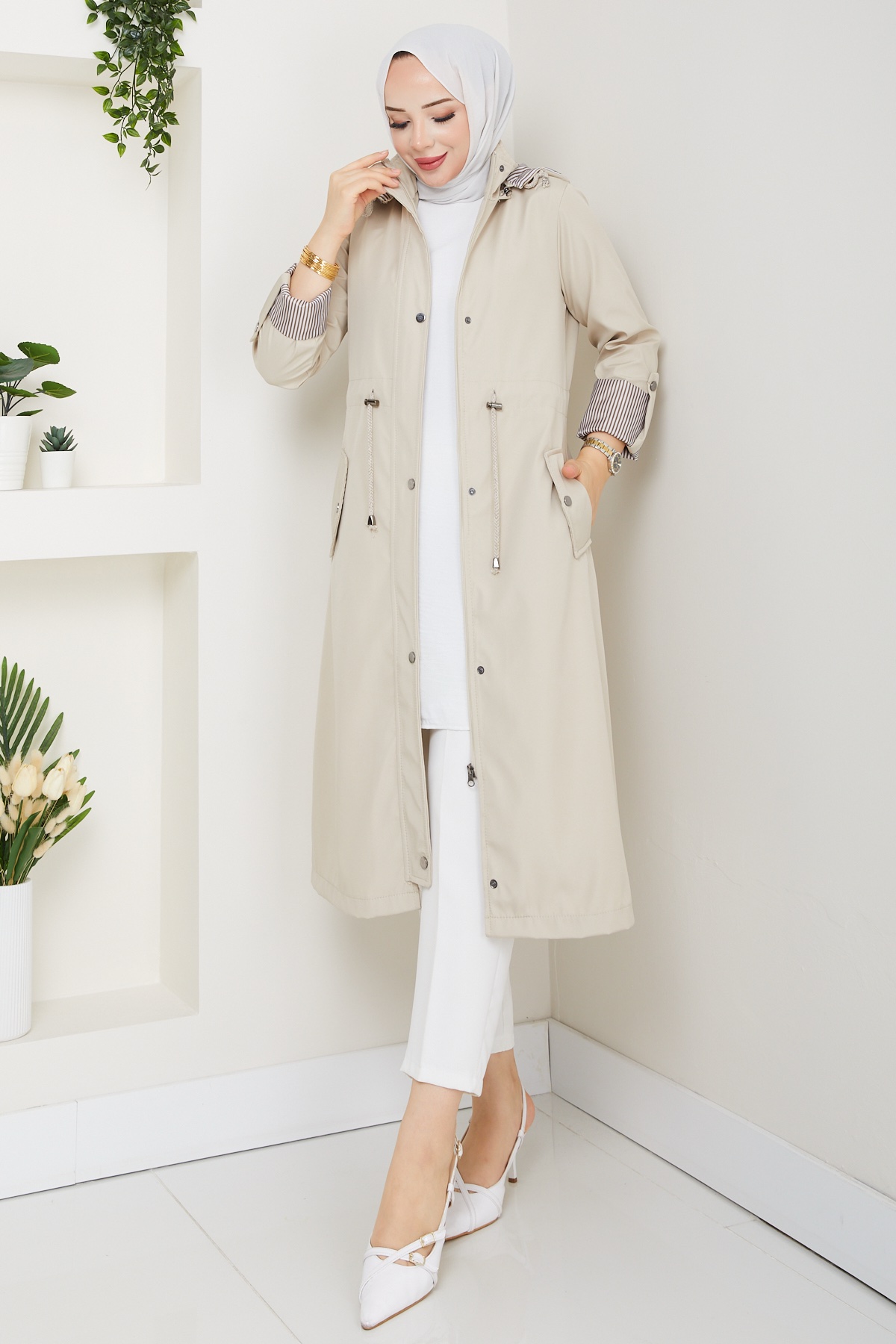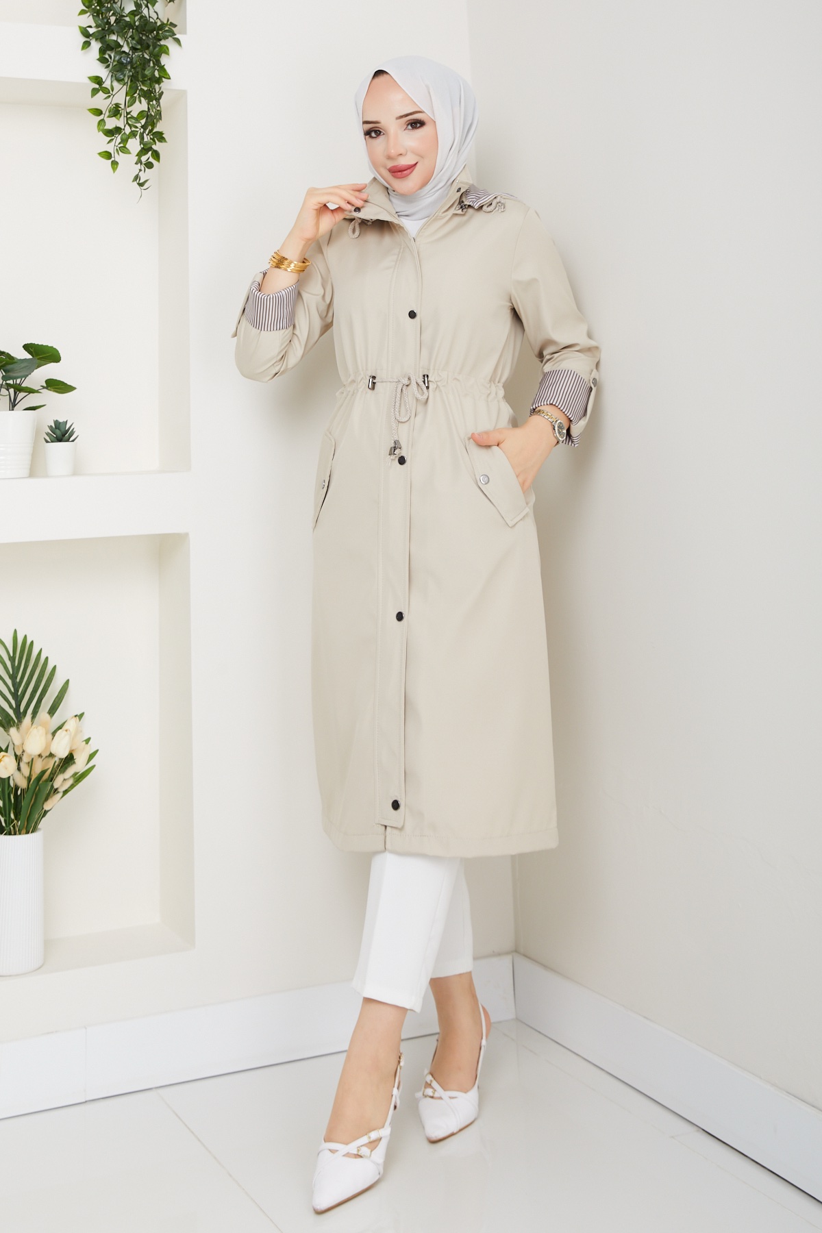 Trençkot cızgılı astarlı taş renk