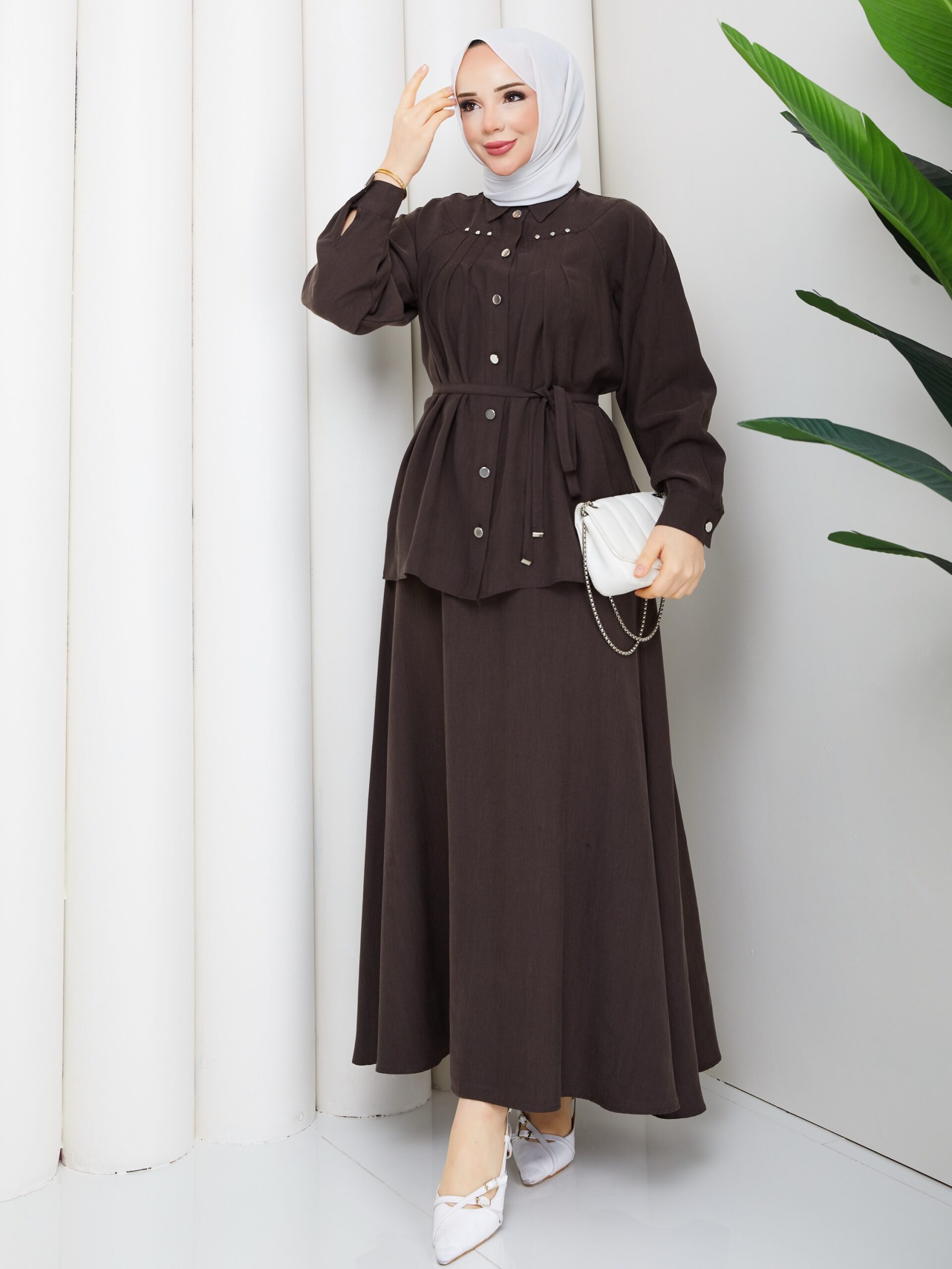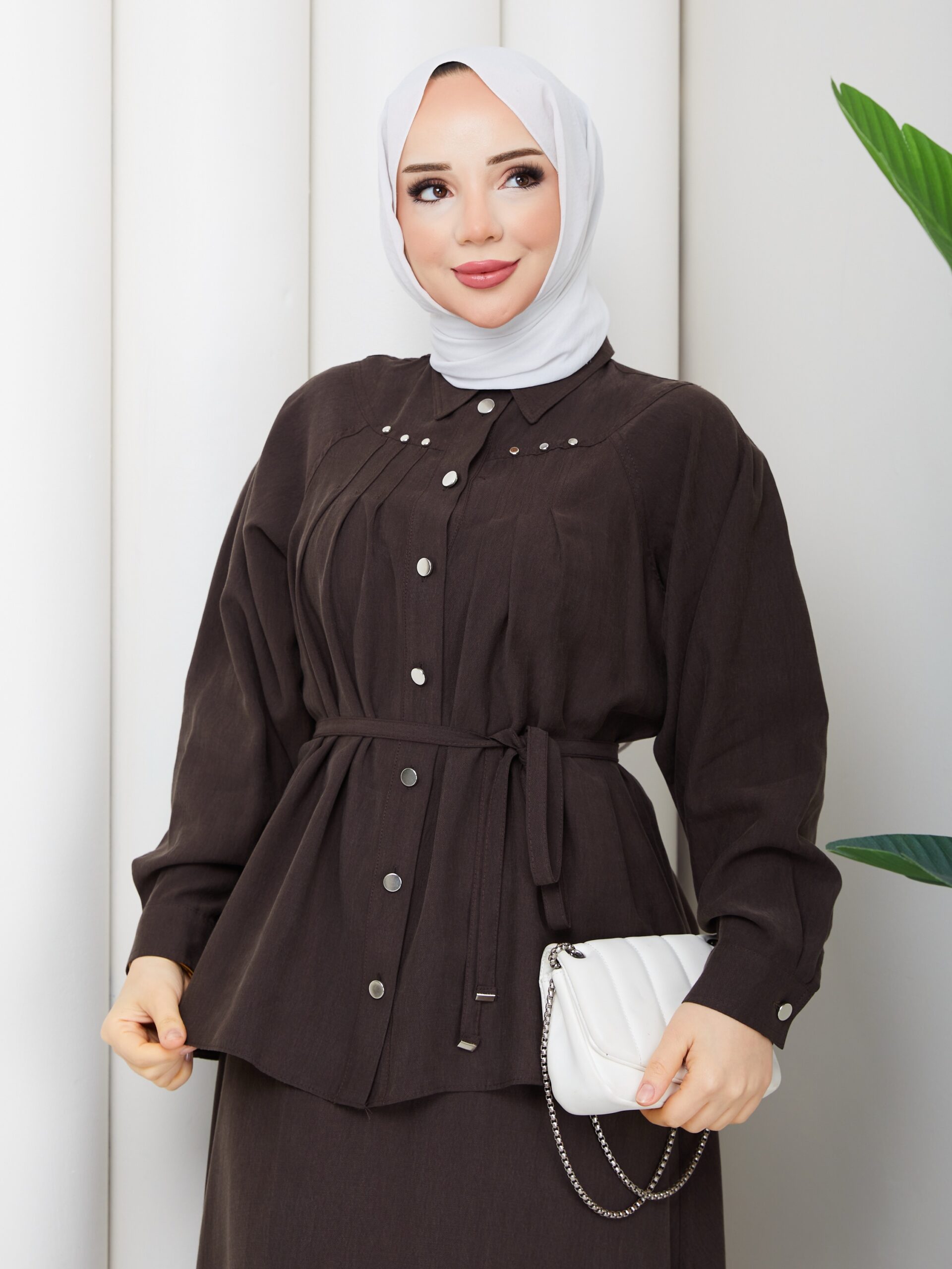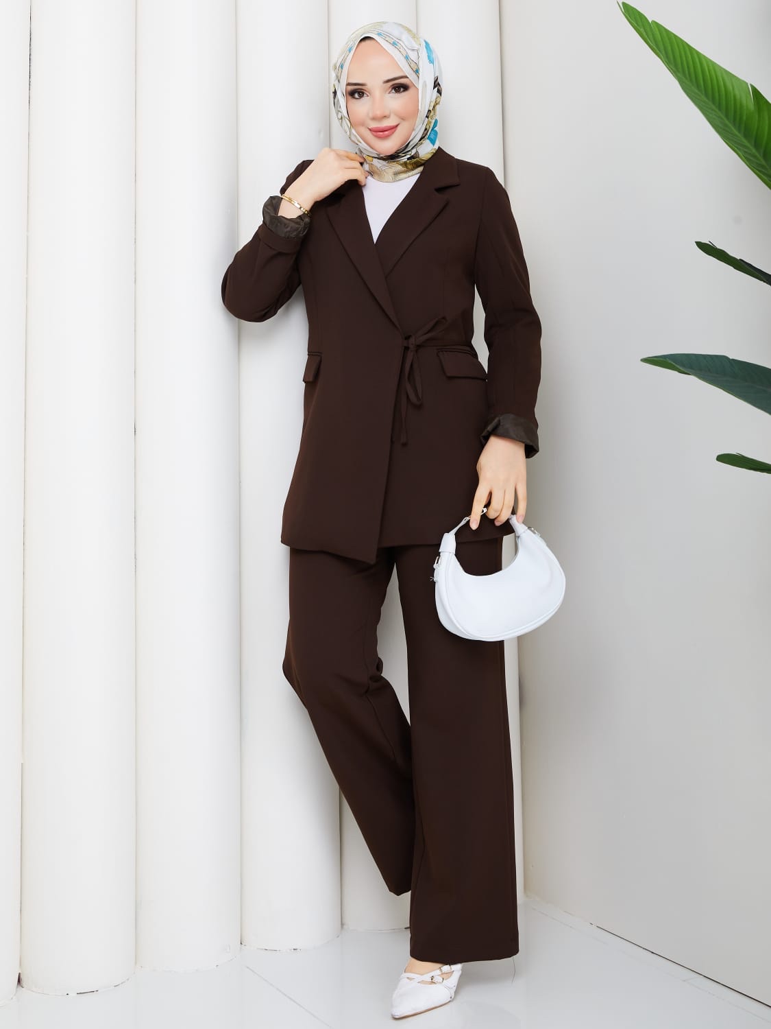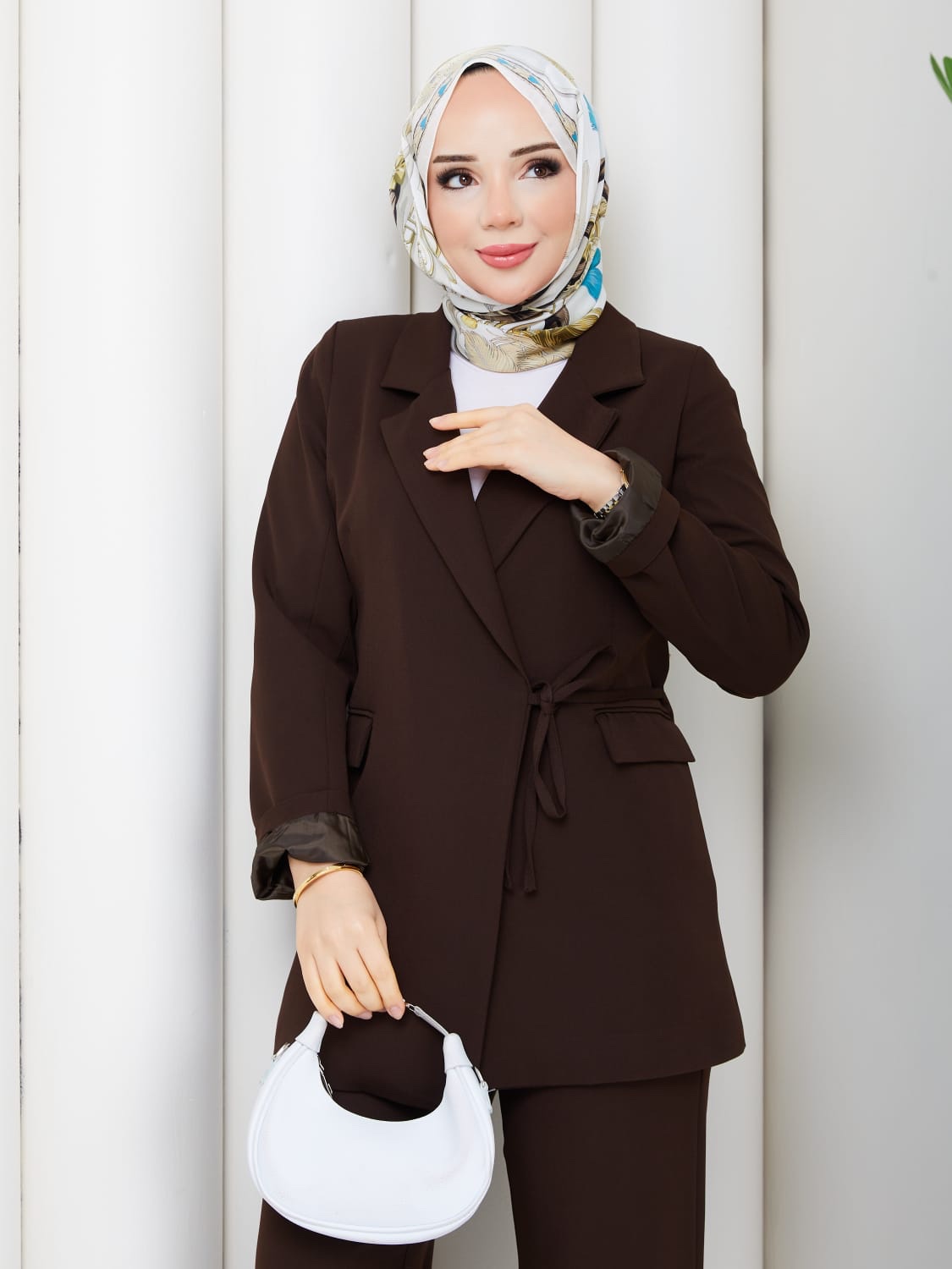 Kahverengı ıkılı takım ceket bağlamalı