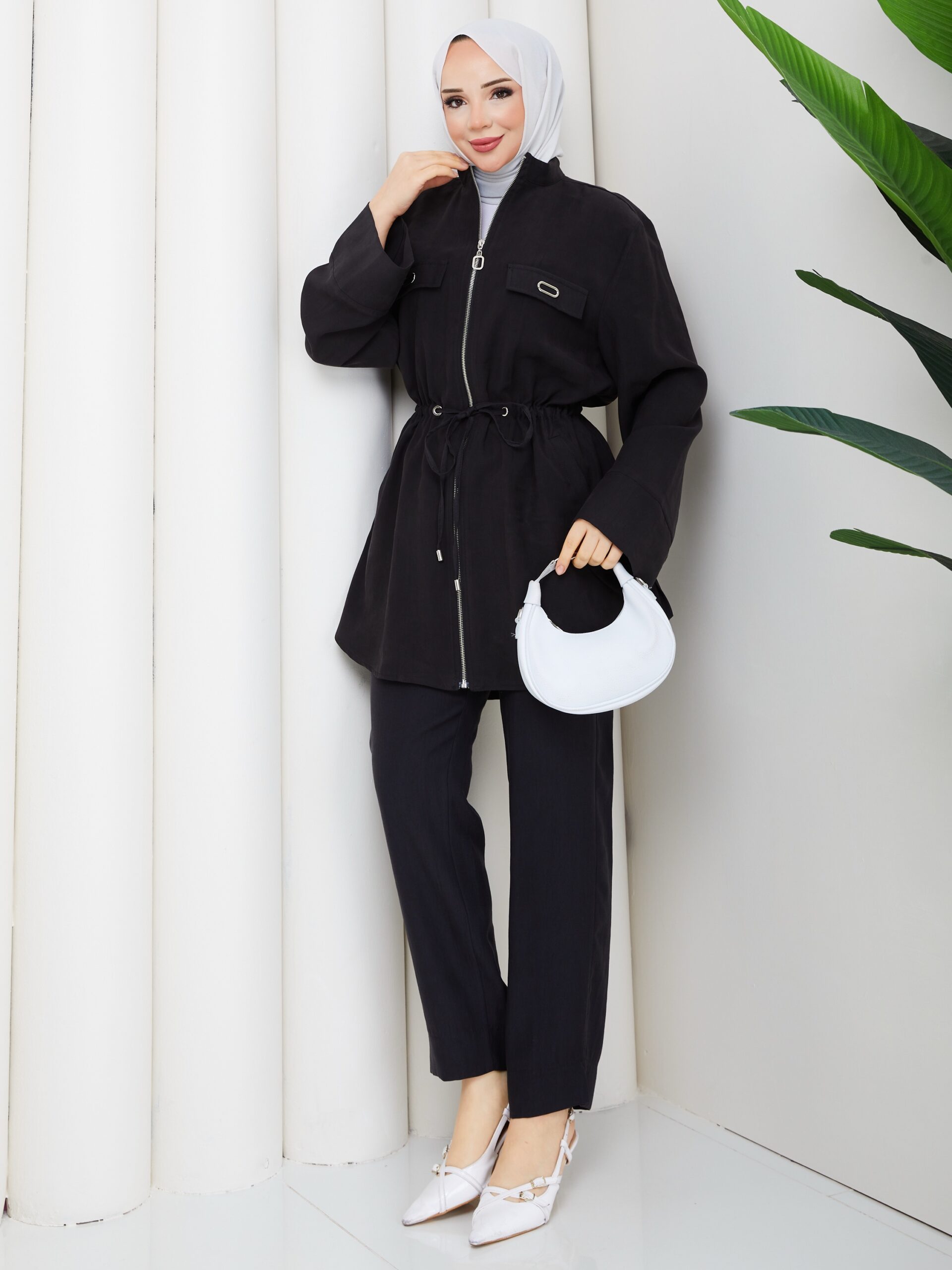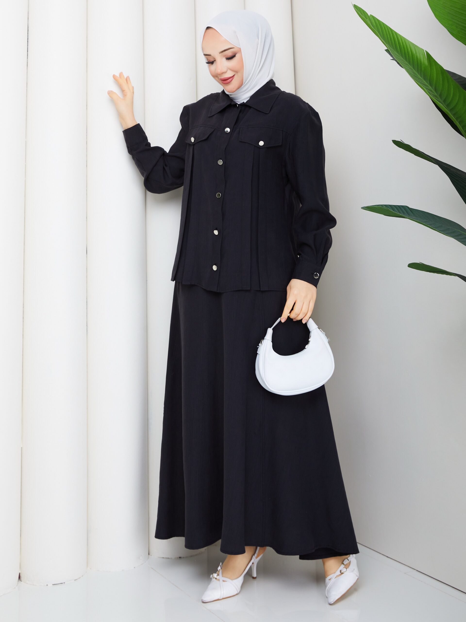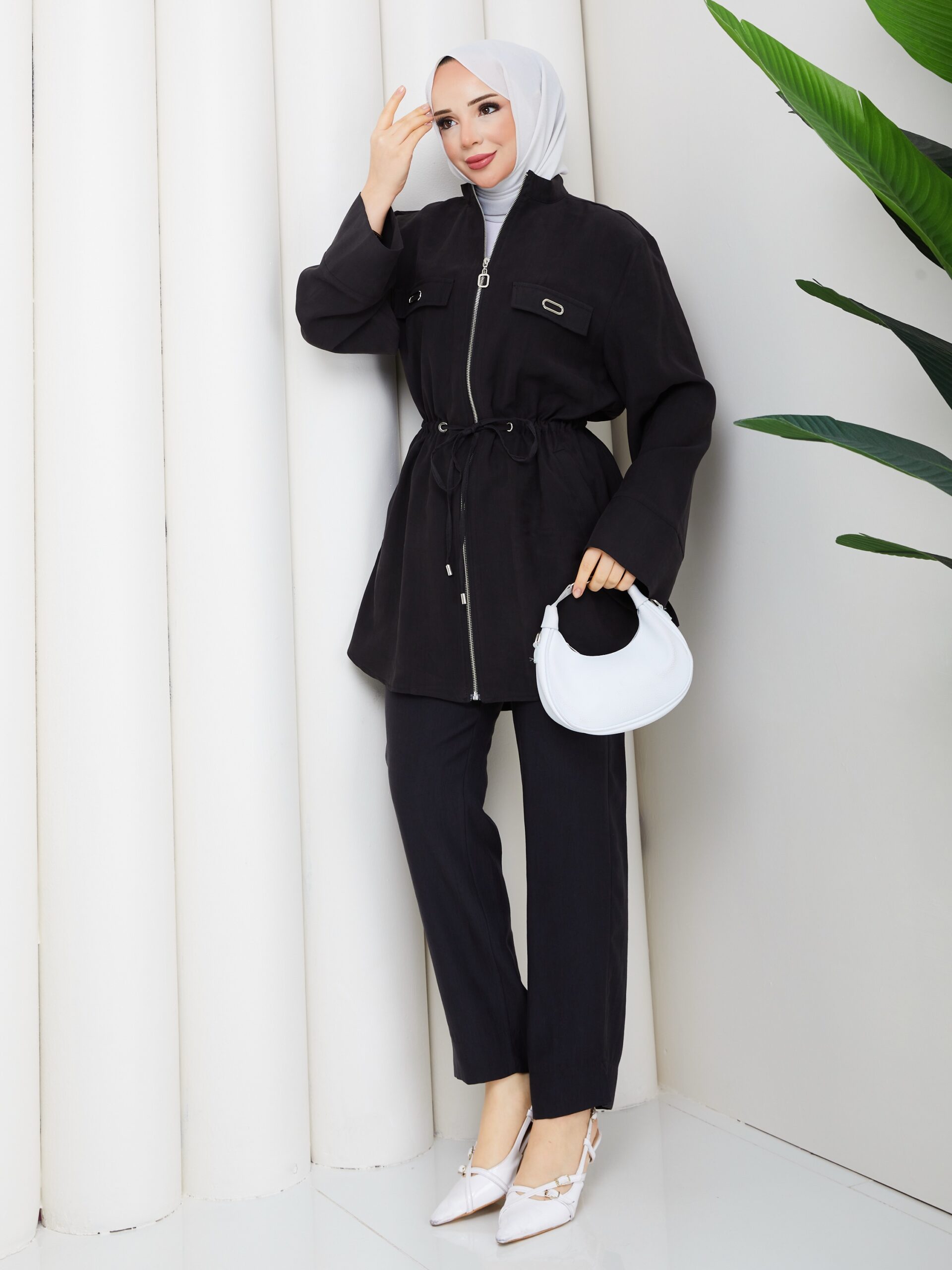 Sıyah tensel kumaş pantolonlu takım