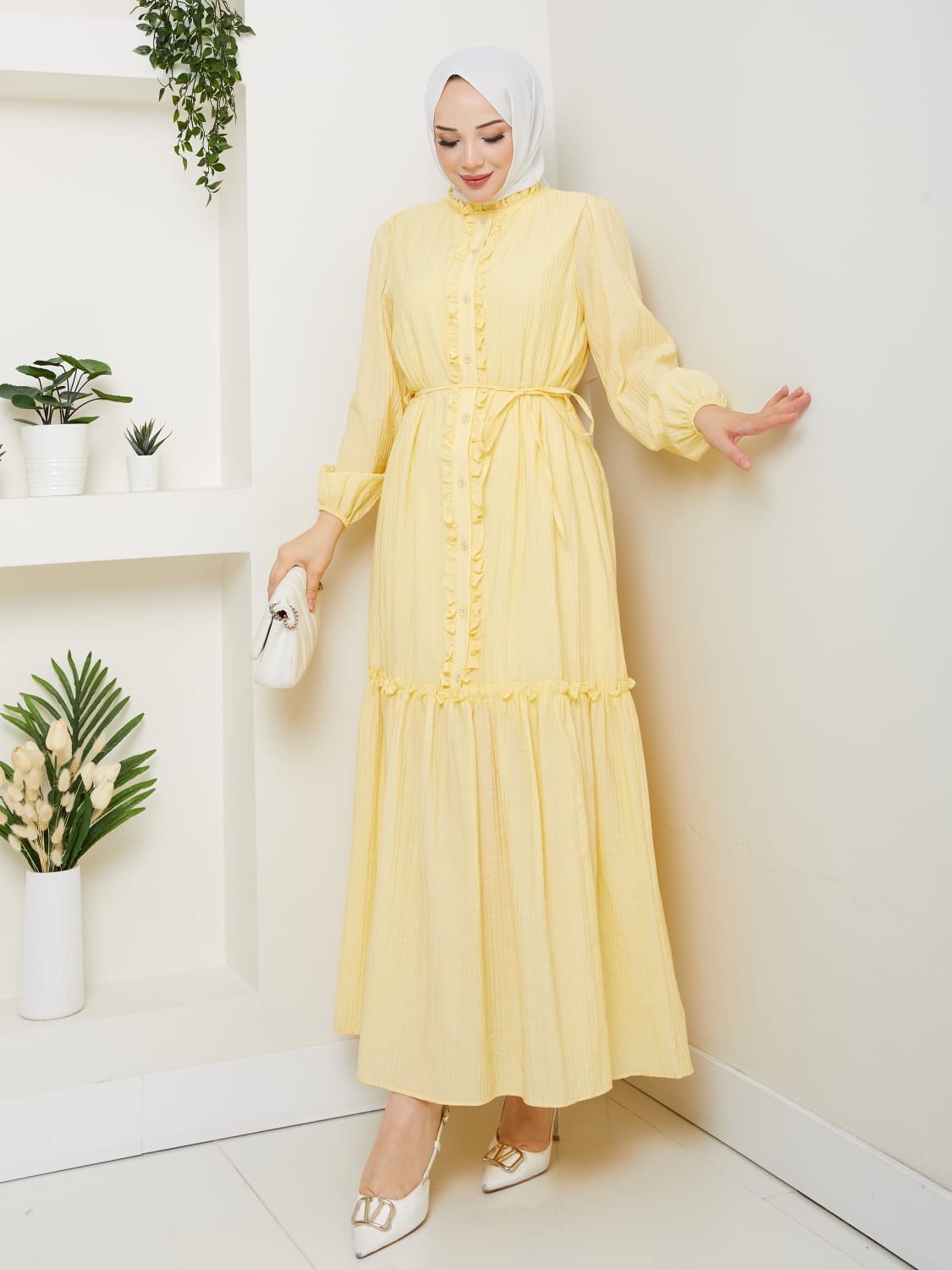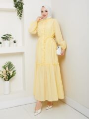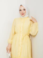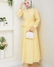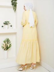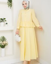 Sarı renk ıkılı takım keten kumaş etek kısmı astarlıdır..