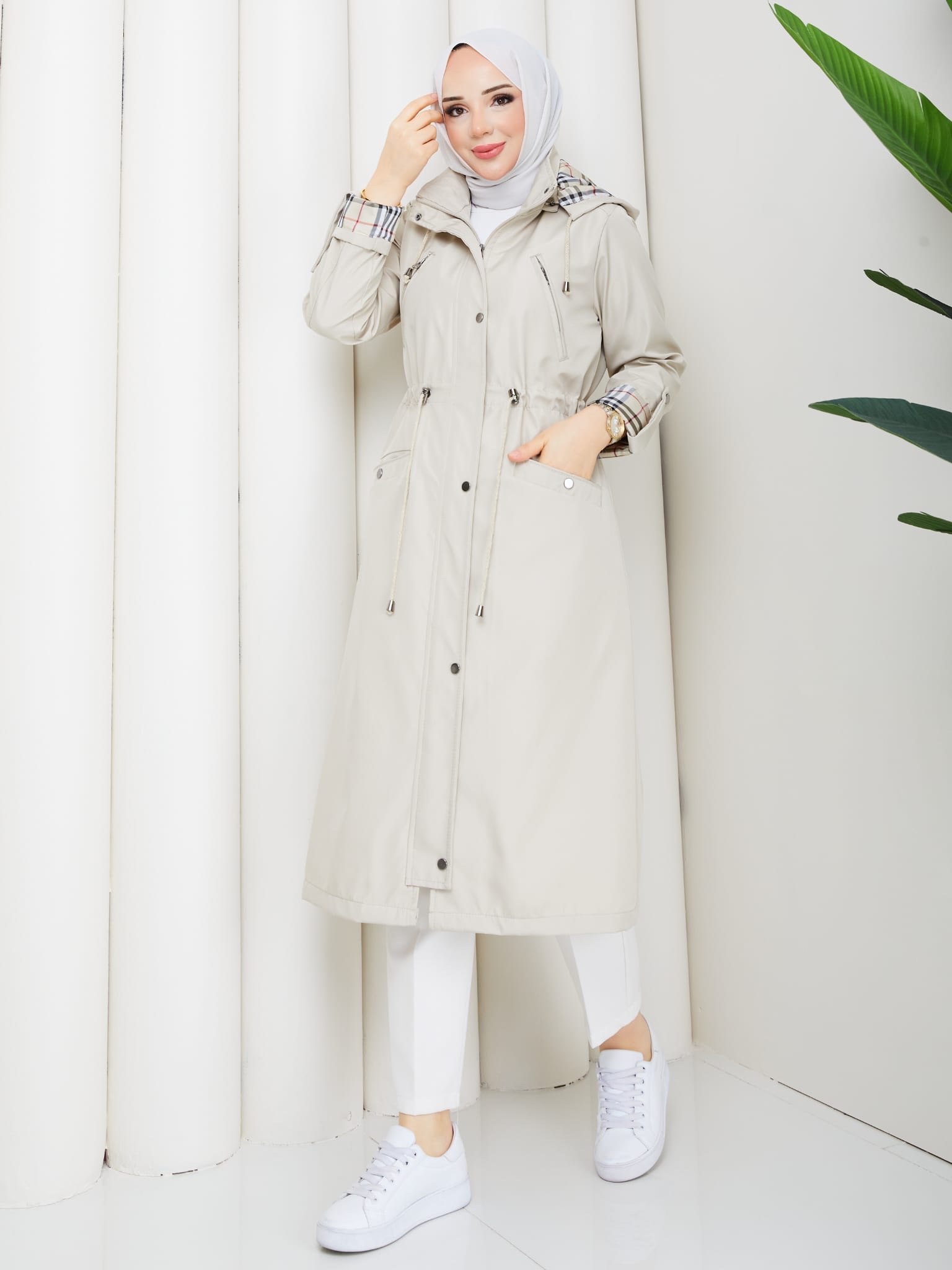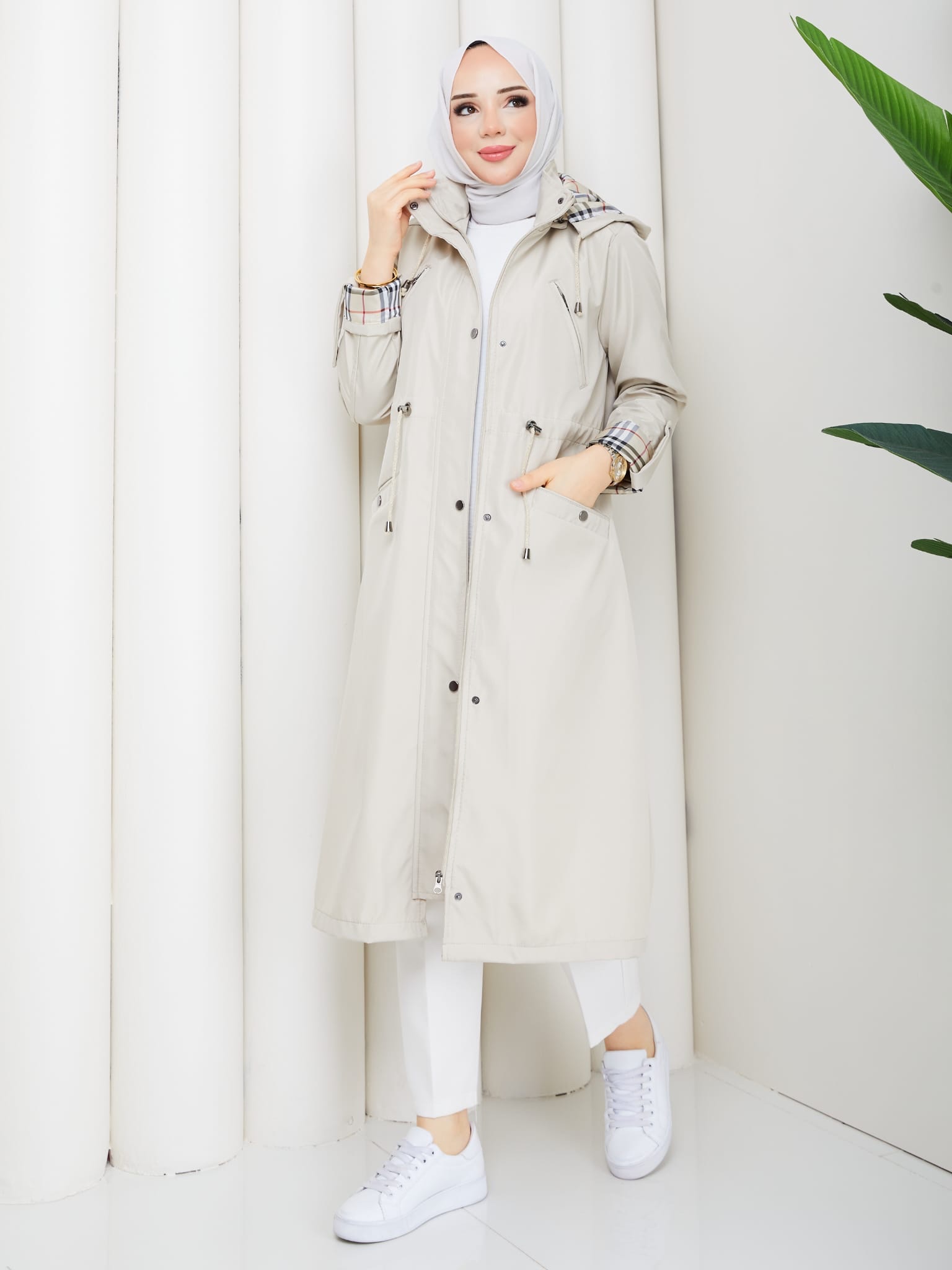 Zarafetin en sağlam hali. Bonded kumaşın kendine has tok duruşu ve rüzgara karşı dayanıklı yapısı, iç kısımdaki klasik kareli astarla buluşarak bahar stilinize seviye atlatıyor. 110 cm uzunluğuyla modern bir silüet çizen bu model, gardırobunuzun en uzun ömürlü parçası olmaya aday.
